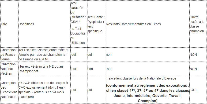CHAMPION : de 15mois a 8 ans. Le chien est déjà titulaire d'un titre de Champion homologué par la FCI. Concours pour le